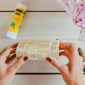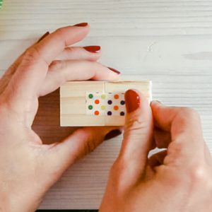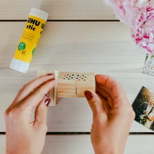 Prepare the dice – 8 dice are required for a photo dice. You start by gluing the wooden cubes together in groups of 2 with a piece of masking tape. Simply place 2 cubes next to each other and glue one side together, fold this side down and fix the same edge from the other side again so that the cubes are connected to each other on both sides. We do this with all 4 pairs of two.
