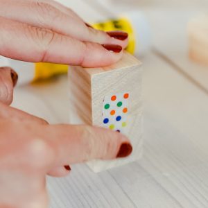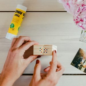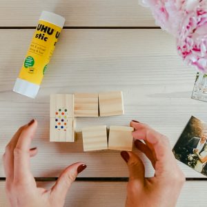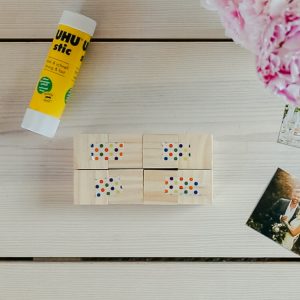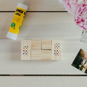 Prepare the dice – 8 dice are required for a photo dice. You start by gluing the wooden cubes together in groups of 2 with a piece of masking tape. Simply place 2 cubes next to each other and glue one side together, fold this side down and fix the same edge from the other side again so that the cubes are connected to each other on both sides. We do this with all 4 pairs of two.